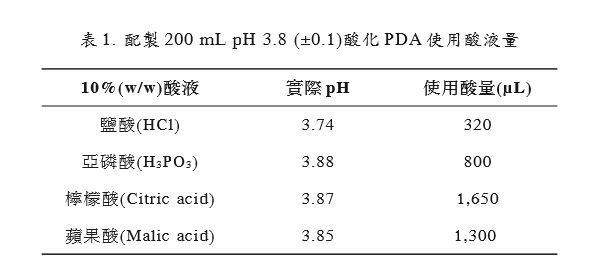 酸化馬鈴薯葡萄糖洋菜培養(yǎng)基(酸化 PDA) 制備 將 PDB 粉末加入總體積2% Agar,以 121℃高溫高壓滅菌15分鐘,冷卻至45-50℃, 加入先前制備好之酸液由pH 5.1調(diào)整pH至 3.8、3.5、3.0與 2.5。 酸化 PDA 配制方法經(jīng)預(yù)實驗結(jié)果如表 1,不同酸液調(diào)整至pH 3.8 (±0.1)使用酸液量