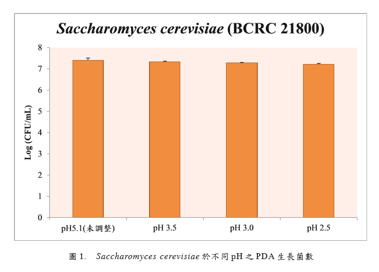 酸性PDA對于乳酸菌與真菌生長活性測試 乳酸菌實驗方法同上述乳酸菌于PDA上 生長活性測試,使用培養(yǎng)基為酸化PDA,倒 置培養(yǎng)于25℃培養(yǎng)5-7天,培養(yǎng)后計數(shù)平板 上的單一菌落,菌落計數(shù)范圍介于25~250 CFU之間,兩平板菌落數(shù)平均后得實驗結(jié)果。 霉菌與酵母菌實驗方法同上述霉菌與酵 母菌檢測,將霉菌、酵母菌以傾注法于各酸