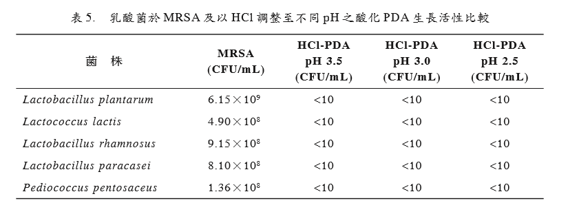 通用培養(yǎng)基,乳酸活菌雖然可以生長于此培 養(yǎng)基上,但對于部分乳酸菌較為不適,而生 長出的乳酸菌菌落形態(tài)會偏細小,較不易計 數(shù)。 藉由不同酸液調(diào)整至 pH 3.8之 PDA 確 認乳酸菌于一般酸化PDA生長活性。由表4 結(jié)果顯示部分乳酸菌由調(diào)整至pH 3.8 PDA傾 注培養(yǎng)幾乎沒有活性,但是 Lactobacillus