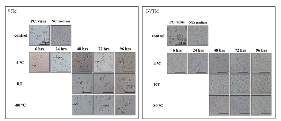 皆發(fā)現(xiàn) CPE:細胞呈現(xiàn)皺縮、變圓、出現(xiàn)空泡、凝聚、和脫落等現(xiàn)象(箭頭)。(B) I-VTM 的陰性控制組與實驗組 細胞皆無 CPE,而陽性控制組則有 CPE。