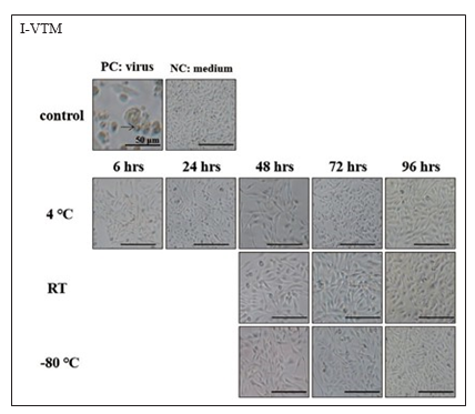 圖中包括含陽性控制組(PC: virus)、陰性控制組(NC: medium)與實驗組(4C、RT 及-80C)之細胞形態(tài)。顯微鏡 (200x)觀察。(A) VTM 的陰性控制組顯示細胞完整,無細胞病變(CPE);陽性控制組與實驗組在所有溫度及時間下